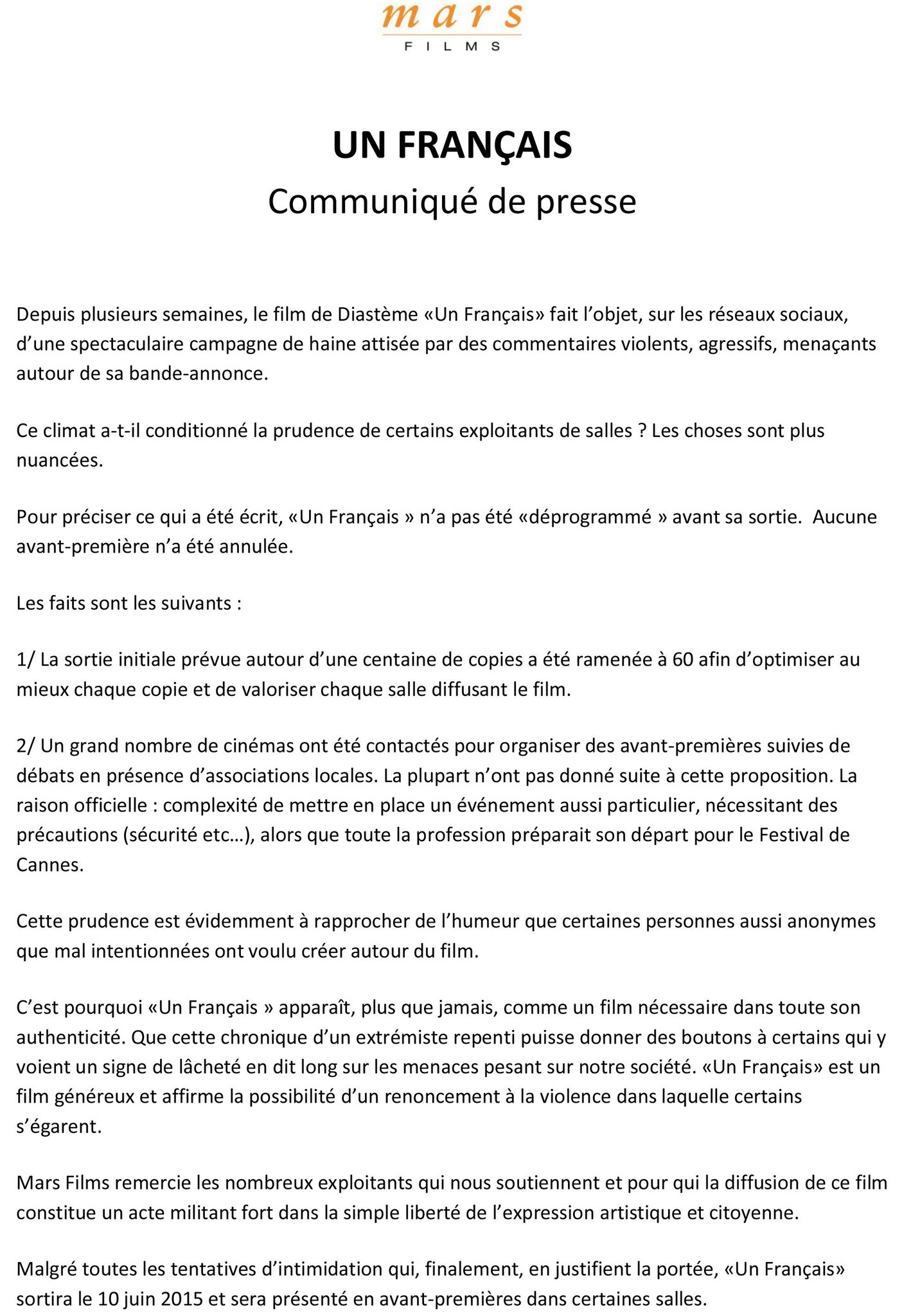 Largement repris dans les médias, l’article alimente les discussions et les rumeurs : commentaires agressifs, voire violents, peur de représailles ou pressions politiques ? Il n’en fallut pas plus pour créer une polémique. Histoire de calmer le jeu, la boîte de distribution s’est fendue d’un communiqué un peu vague, à partir duquel il est difficile de déterminer la vraie raison de cette distribution somme toute confidentielle. Pour finir, Un français obtiendra dans les 65 copies, ce qui reste assez peu, mais devrait permettre aux habitants des grandes villes d’aller le voir.